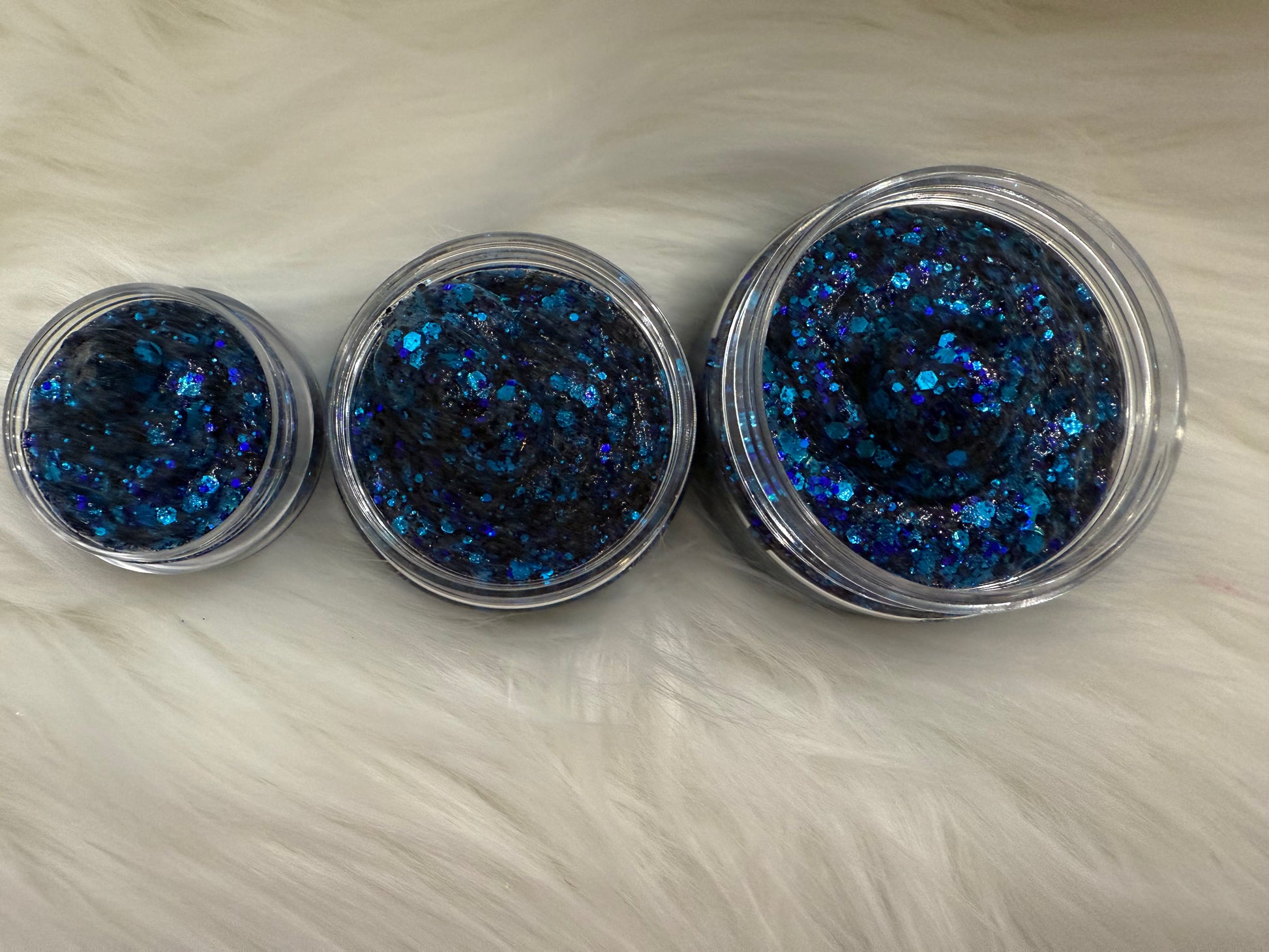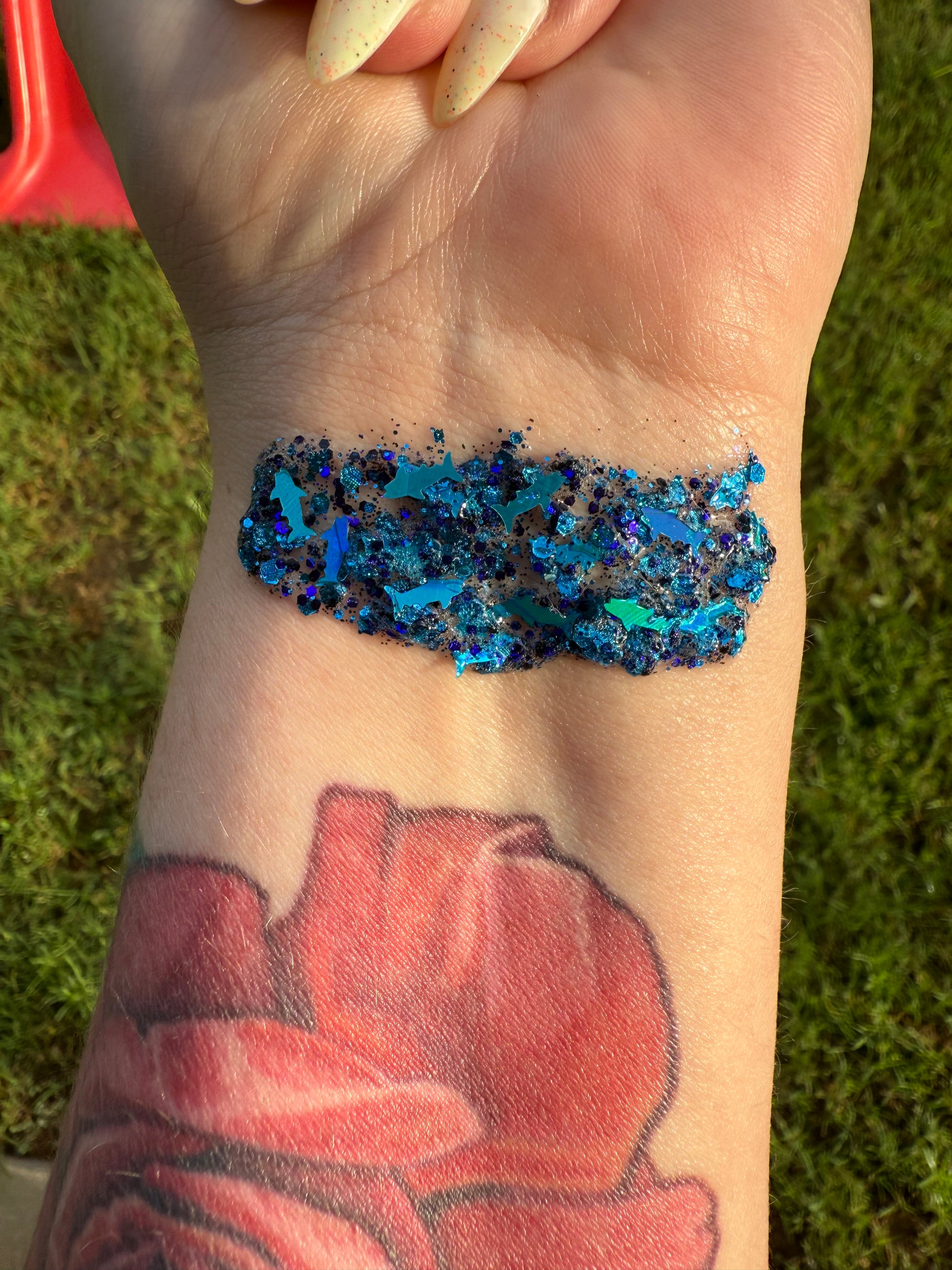 A bold, moody blend of midnight blue and black chunky glitter with fierce bright blue sharks swimming through the sparkle. For the babes who glitter with bite. πβ‘Β