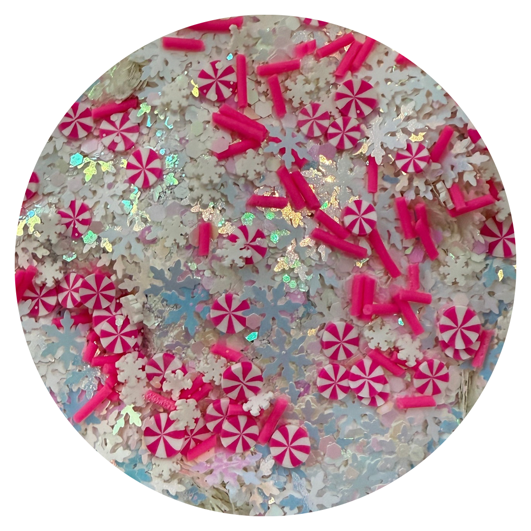 “Frosted Fetch” is a fabulously frosty blend of white and pink iridescent snowflakes swirling with chunky winter shimmer, all topped off with bright pink peppermint pieces that look straight out of a Candy Cane-Gram—but, like… make it fashion.