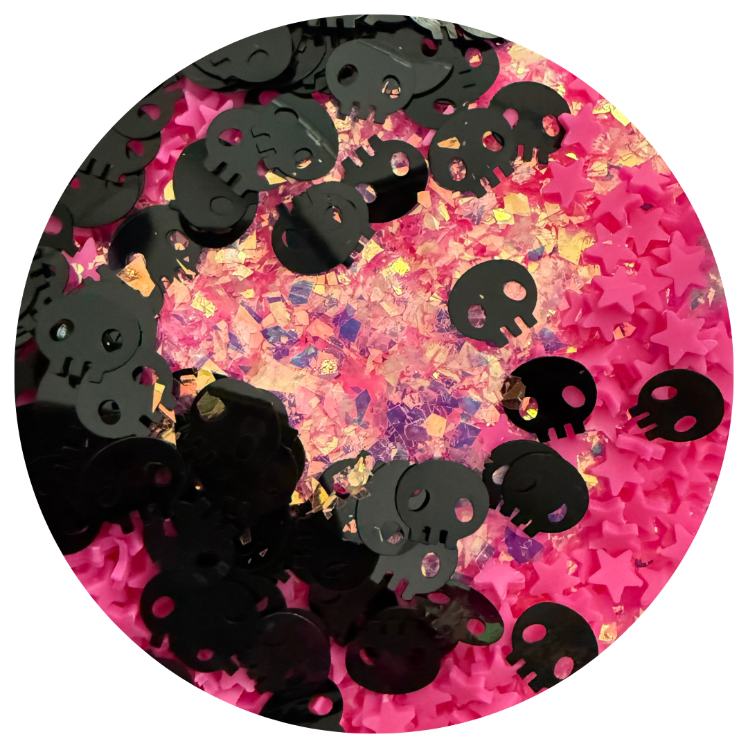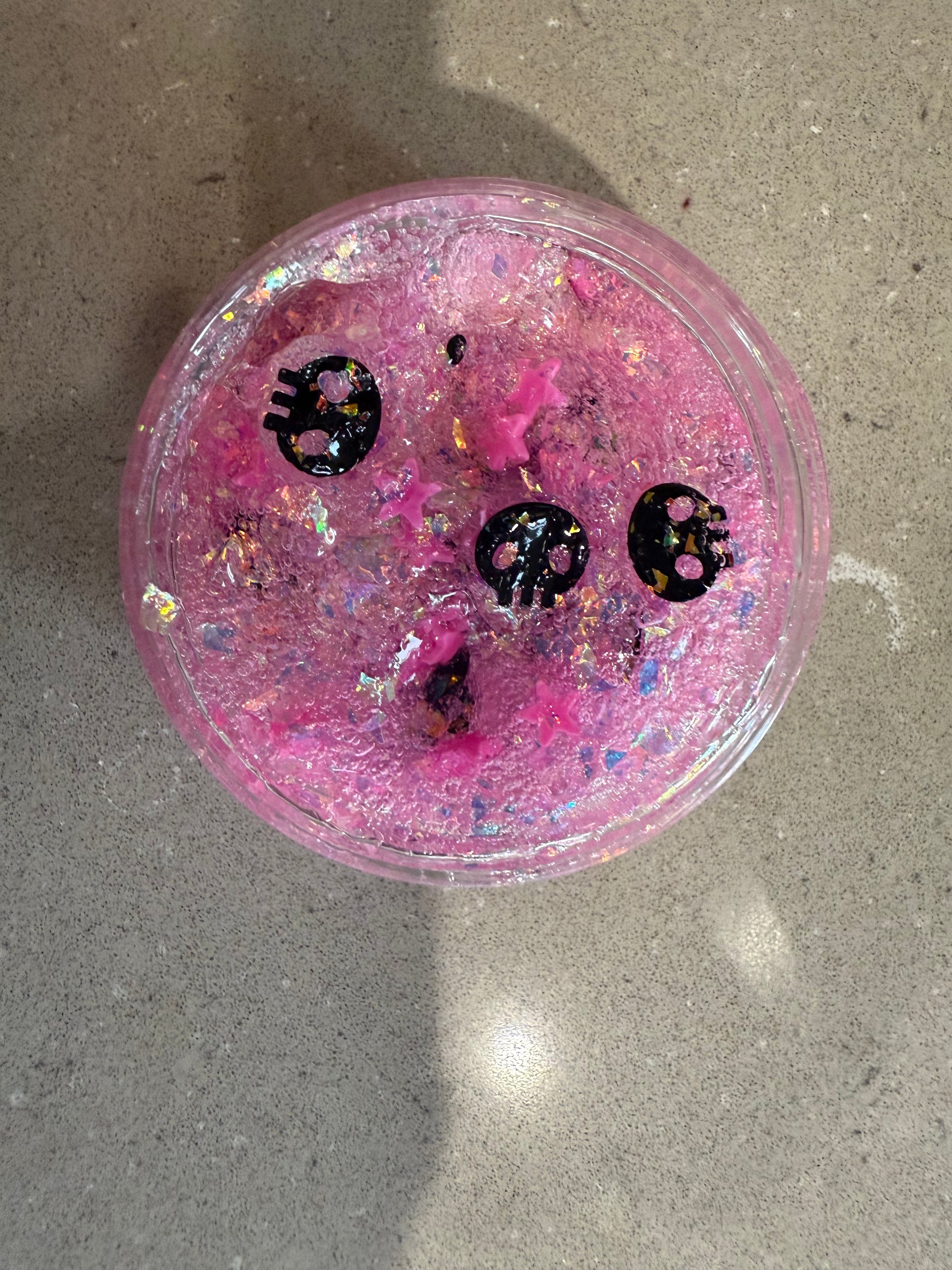 Sweet, spooky, and full of attitude. A pink opal base swirls with large black skulls and pink star clays in a firm hold gel—equal parts pretty and punk. Perfect for little ghouls with big glitter goals. 💀✨