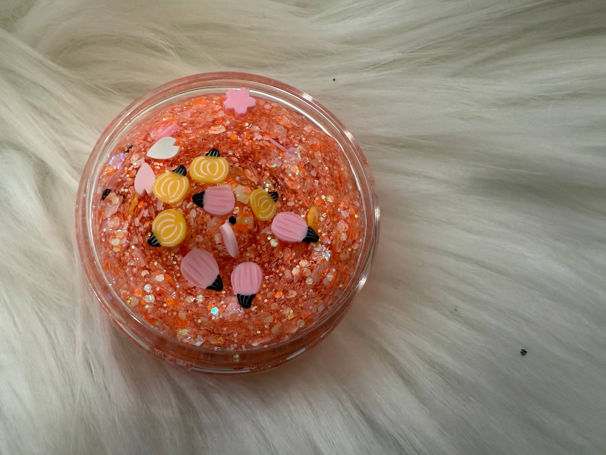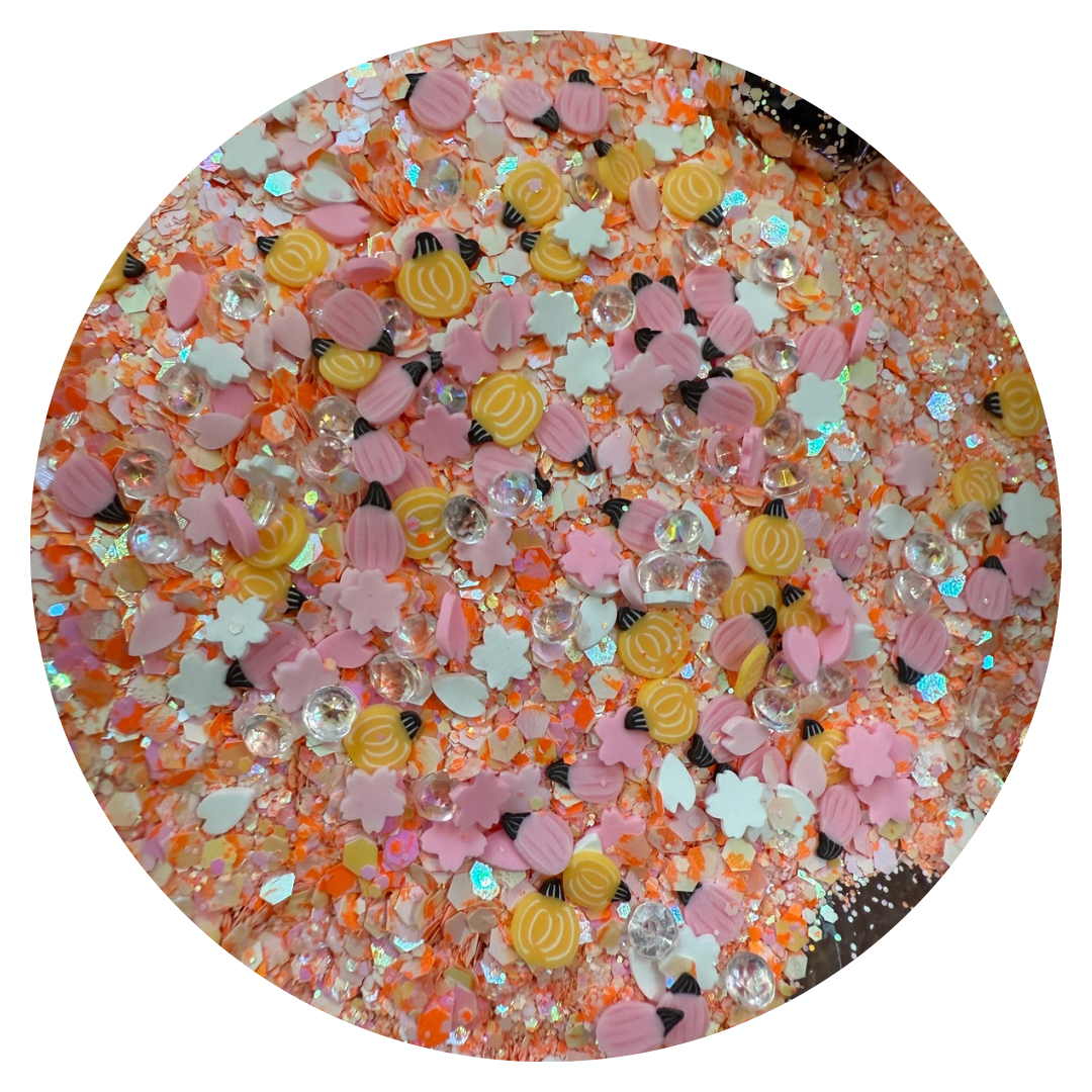 This dreamy mix of pastel pink and orange is sprinkled with confetti blossoms, tiny clay pumpkins, and 3D sequins for a glitter thatβs giving enchanted pumpkin patch vibes. ππ§ββοΈπ«