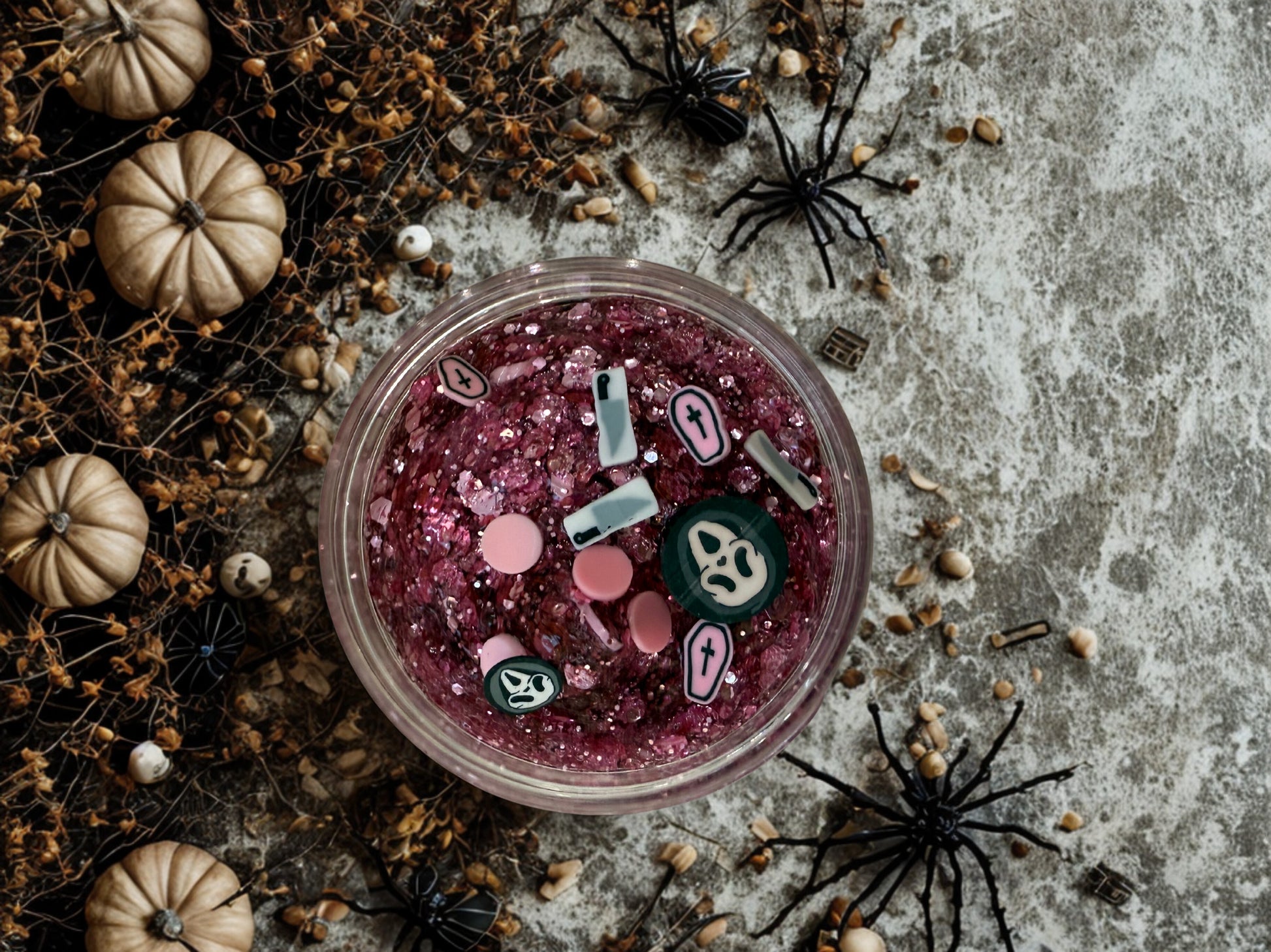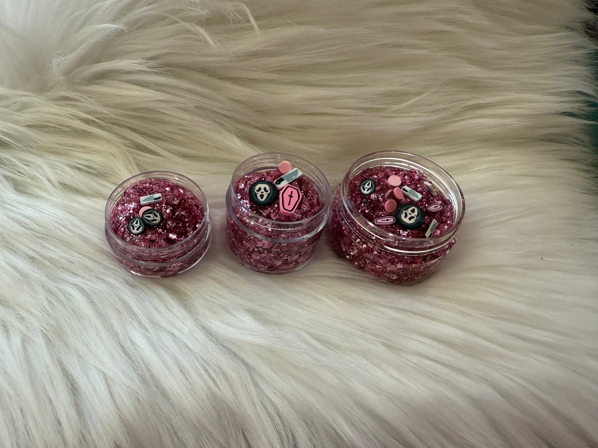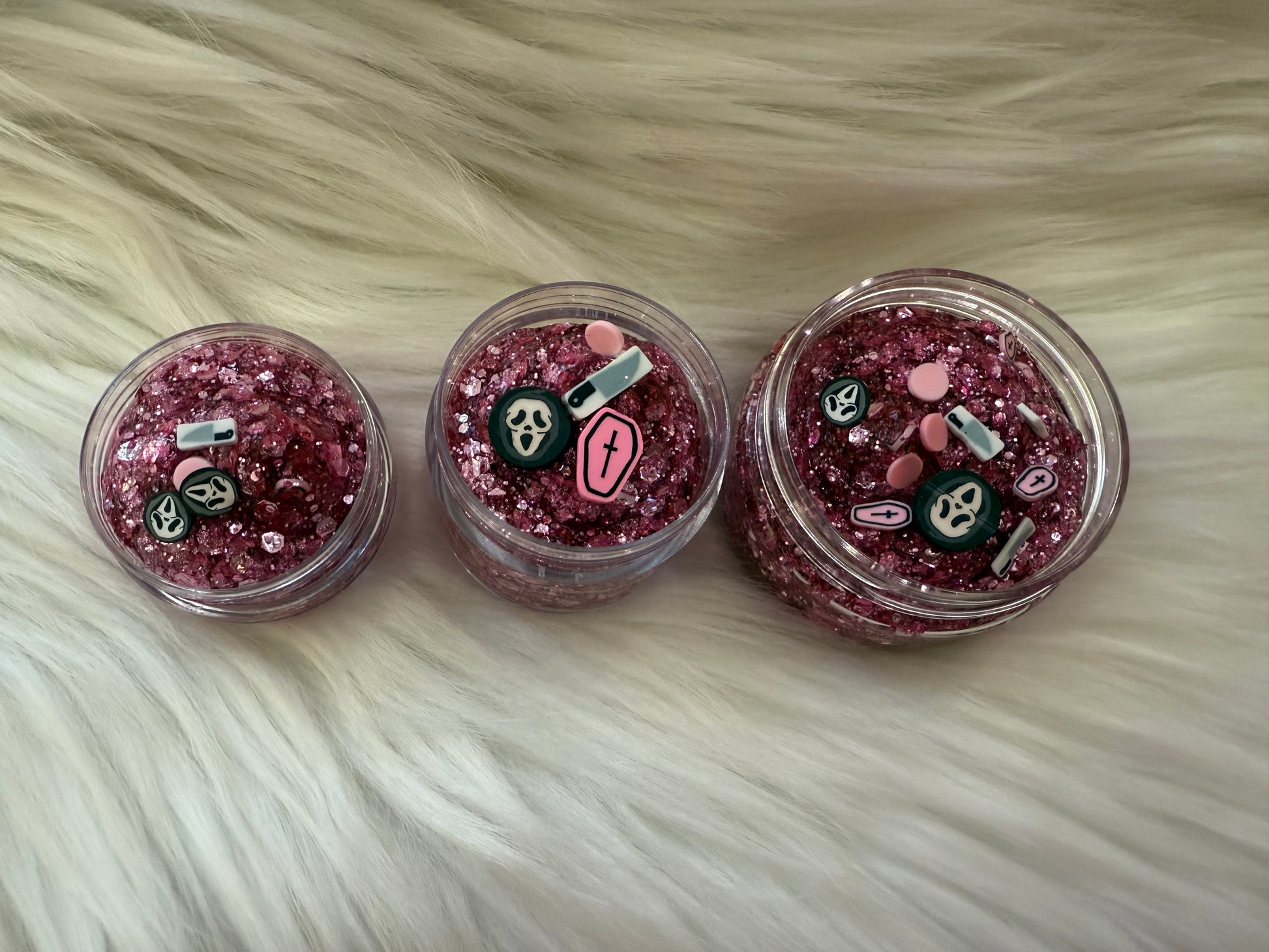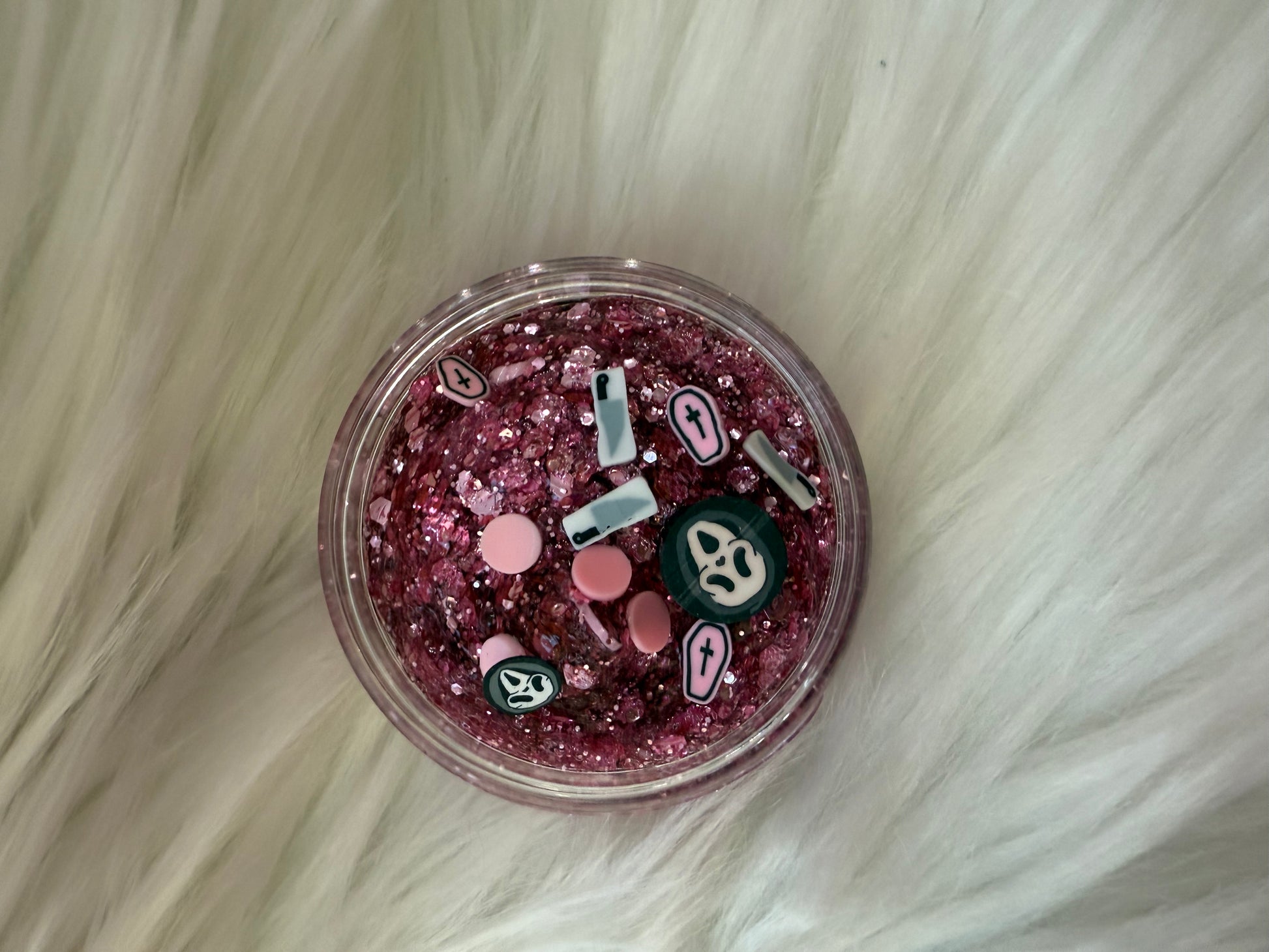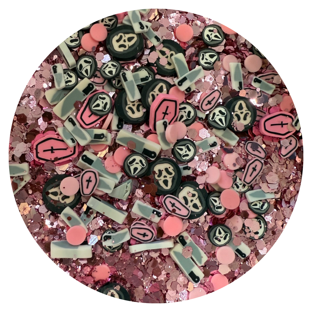 🔪👻 Sweet Screams 💕 Don’t be fooled by the pretty pink sparkle—this glitter mix comes with a deadly twist! Featuring clay knives and Ghostface himself, it’s the perfect combo of cute and creepy for all your killer looks. ✨💗🔪