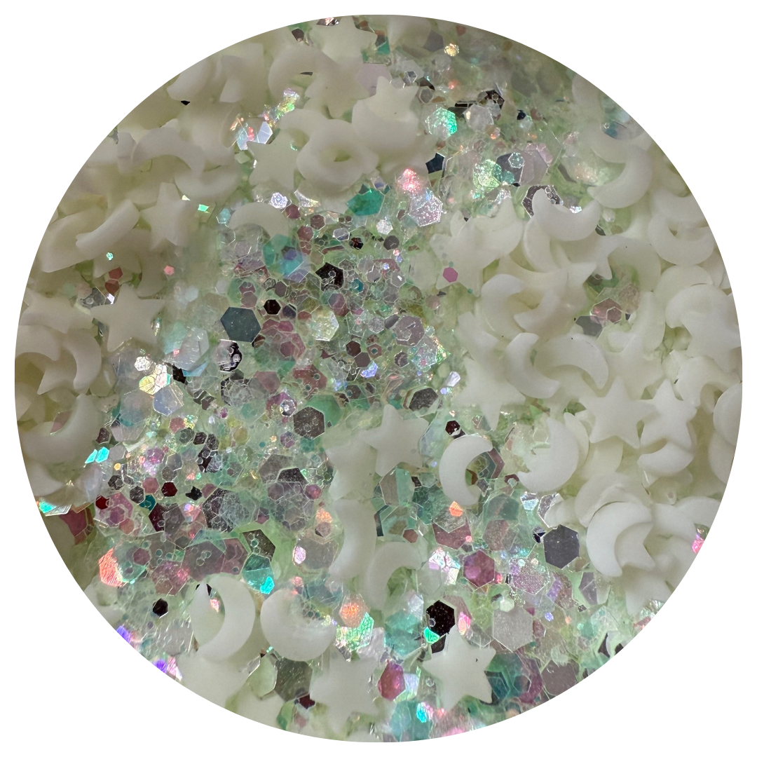 🌙✨ Say hello to Lunar Glow — a dreamy blend of glow-in-the-dark moons and stars floating in soft green opal glitter magic. This chunky shimmer charges in the light and glows when the night falls, giving major celestial vibes 🌌 Perfect for stargazers, moon babes, and glitter lovers alike. Medium hold, out-of-this-world sparkle!